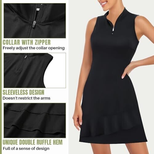 The product is a women's athletic dress with built‑in shorts. It features a front zipper design for adjustable neckline and ventilation. It has a sleeveless silhouette with a double‑layer flared hem. The inner shorts are separate from the dress and include a pocket for small items. Fabric composition is 88% polyester and 12% spandex, providing breathability and stretch. Suitable for outdoor sports such as golf and tennis.