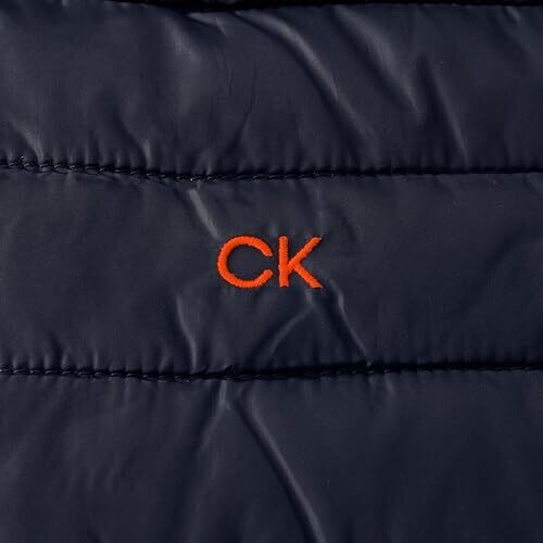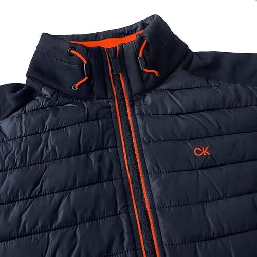 Elevate your on-course performance with a lightweight, moisture-wicking Calvin Klein CK Hybrid Golf Jacket in Navy/Orange. It moves with you through every swing, offers warmth without bulk, and features discreet pockets and a refined knitted collar for a premium finish.