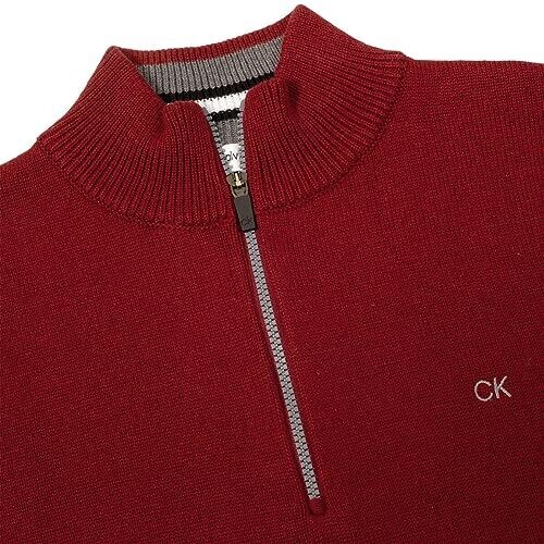 Elevate your golf look with the Calvin Klein Golf cotton jumper in burgundy, size 5XL. Soft cotton/acrylic blend delivers lasting comfort on the course, with a half-zip funnel neck, contrast zip details, and subtle CK branding for a sharp, sporty finish.