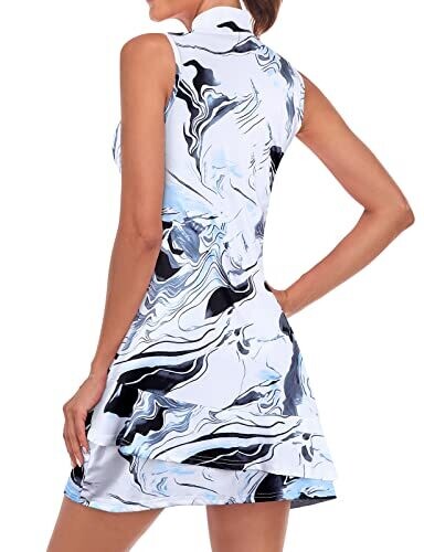 A sleeveless golf dress for women with built-in shorts and pockets, featuring a ruffle detail and a zip-up stand collar. This golf outfit offers functional storage and a stylish ink-wash painting-inspired look in a medium size.