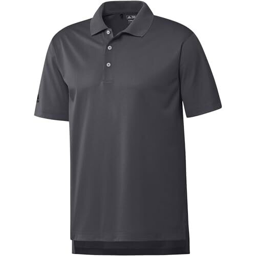 Open hem, set-in sleeves; 4.3 oz., 100% recycled polyester; UPF 25 protection. Hydrophilic finish; Ribbed knit collar; Three button placket; Contrast color listed refers to adidas performance heat transfer logo on right sleeve.