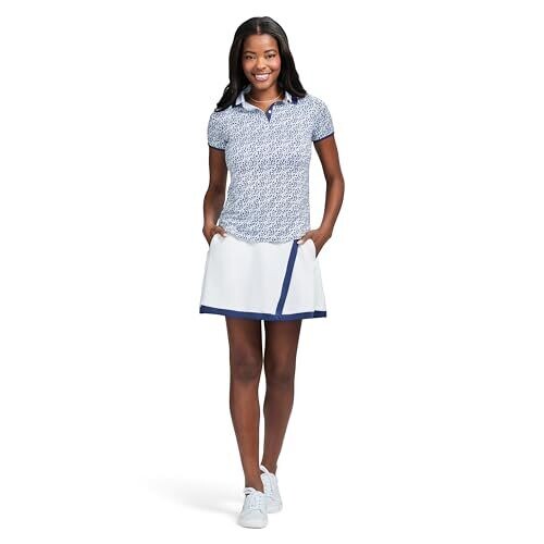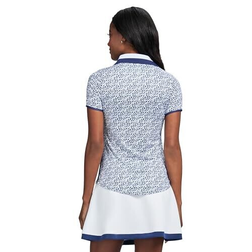 Made of 88% polyester and 12% Spandex for a lightweight feel and stretch flexibility. Short-sleeve styling with printed fabric and solid knit. Classic polo collar with button placket for a timeless look. Suitable as a women's golf polo shirt and ideal for golf and tennis, combining comfort and style with a versatile fit.