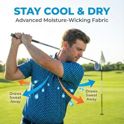 - Moisture-wicking fabric keeps you cool and dry from tee box to clubhouse.