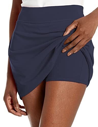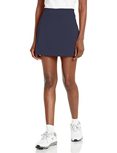 The skort length is 16 inches and features a tummy-control waistband with built-in shorts. It uses Airflux ventilation and moisture-wicking fabric to maintain comfort by promoting airflow and moving perspiration away from the body. Seams are designed to stretch, enabling a broader range of motion. It provides UPF 50 sun protection. The product is available in True Navy and sized X-Small through XX-Large.